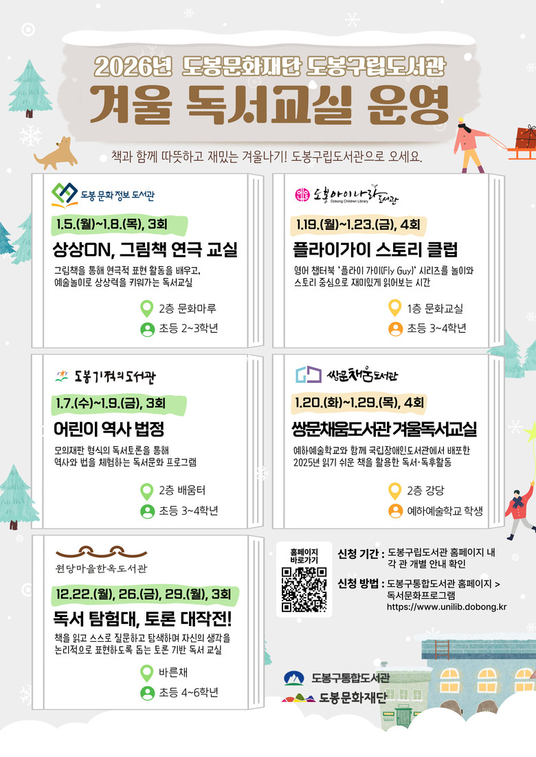 원당마을한옥도서관에서는 12월 22~29일 ‘독서 탐험대, 토론 대작전!’을, 도봉문화정보도서관에서는 1월 5~8일 ‘상상ON, 그림책 연극 교실’을, 도봉기적의도서관에서는 1월 7~9일 ‘어린이 역사 법정’ 프로그램을 운영한다.