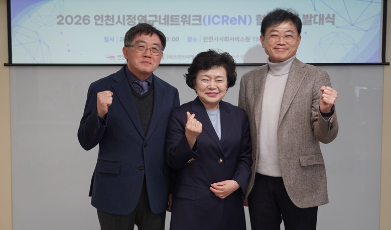 | ▲ (사진 오른쪽부터) 조대흥 인천시사회서비스원장과 김정민 인천여성가족재단 대표이사, 이윤호 인천인재평생교육진흥원장이 지난 6일 2026 인천시정연구네트워크 협업연구 발대식을 열고 기념촬영을 하고 있다. |