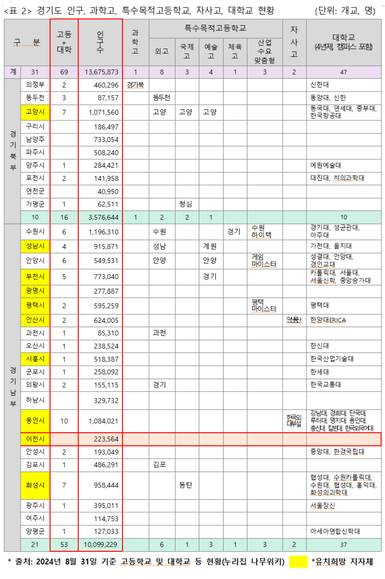 이런 가운데 이천시, 고양시, 용인시, 화성시, 성남시, 부천시, 평택시, 시흥시, 광명시, 안산시 등 10개 지자체가 과학고 유치전에 뛰어들었다. 그래서 경기도 지자체별 인구, 특수목적고등학교, 자립형사립고등학교, 대학교(4년제) 현황 등을 위 표 2와 같이 구분해서 이해를 구했다.