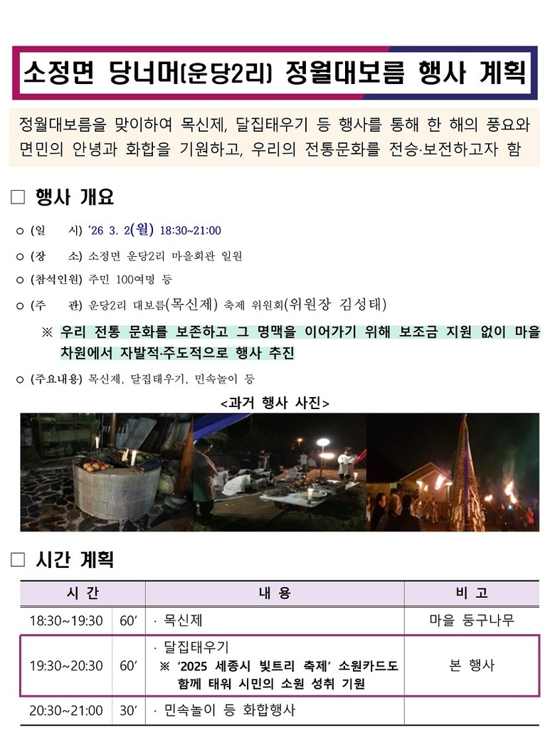세종시 소정면 운당2리 대보름(목신제)축제위원회(위원장 김성태)와 운당2리 애향회(회장 김재령)는 오는 2일 오후 6시 30분 마을회관에서 ‘2026 당너머 정월대보름 행사’를 개최한다.