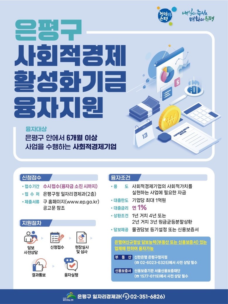이번 사업은 6개월 이상 사업을 수행하는 은평구 소재 사회적경제기업을 대상으로 하며, 기업당 최대 1억 원의 융자를 지원한다. 대출금리는 연 1%이며, 상환 조건은 ▲1년 거치 4년 원금균등분할상환 또는 ▲2년 거치 3년 원금균등분할상환 중 선택할 수 있다.