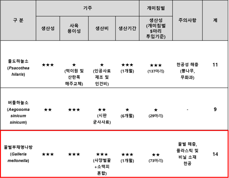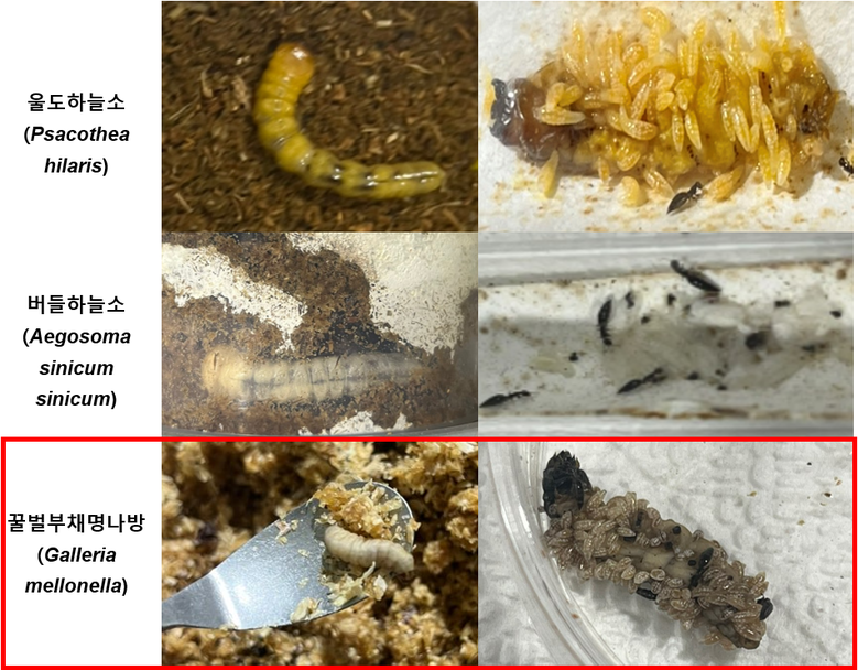 산업곤충연구소는 개미침벌의 안정적인 대량 사육을 위해 2024년 2월부터 울도하늘소, 버들하늘소, 꿀벌부채명나방 등 다양한 유충을 대상으로 생산성과 사육 용이성 비교시험을 진행하고 있다.