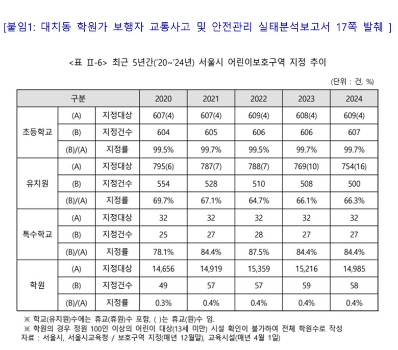 서울특별시의회 윤영희(국민의힘, 비례)이 제안하고 재정분석담당관이 분석한 자료에 따르면, 서울시 내 초등학교의 어린이보호구역 지정률은 99.7%에 달하는 반면, 정원 100인 이상 학원의 보호구역 지정률은 0.4%에 불과한 것으로 확인됐다.