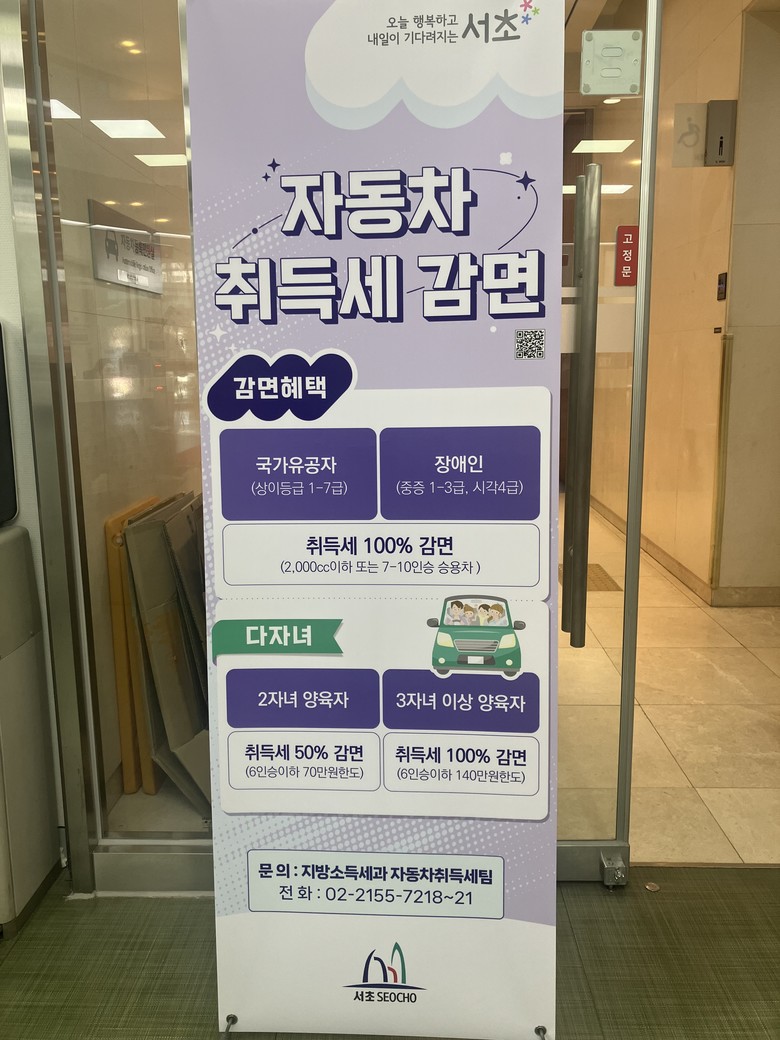 [서초구 세계타임즈=이장성 기자] 서울 서초구(구청장 전성수)가 차량취득세 감면 대상자의 알권리를 강화하고 납세자의 불이익을 사전에 막기 위해 구청 1층 자동차등록 민원실 입구에 '차량취득세 감면 홍보 배너'를 설치하고 안내에 나선다고 밝혔다.