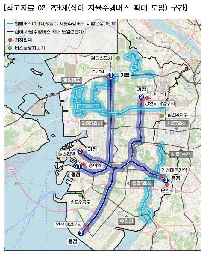 - 2단계(확대도입): 인천대로, 경인로 등 신규 중앙버스전용차로 구축 구간으로 노선을 확대하여 광역교통 주요 거점 간 연결성을 강화