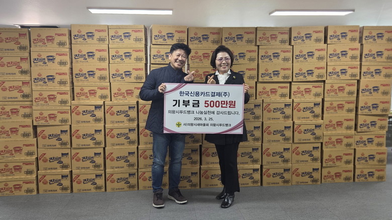 [의왕시 세계타임즈=송민수 기자] 의왕시는 한국신용카드결제(주)가 3월 25일, 관내 취약계층 지원을 위해 500만원 상당의 물품(라면 등)을 의왕시푸드뱅크에 기부하며 지역사회에 따뜻한 마음을 전했다고 밝혔다.