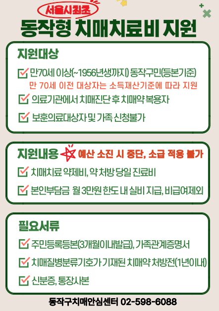 만 70세 이전 대상자(소득재산기준 제한 있음), 협약 의료기관 등 기타 자세한 사항은 동작구치매 안심센터(02-598-6088)로 문의하면 된다.