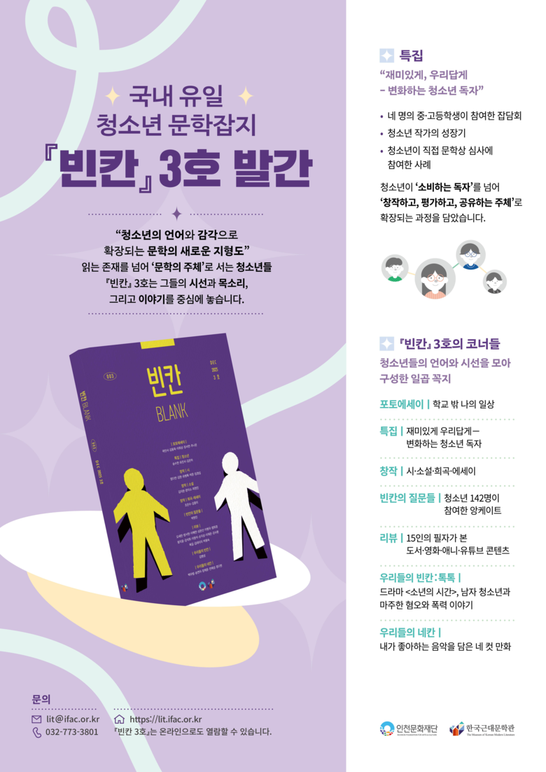 『빈칸』3호는 변화하는 청소년 독자의 모습을 탐색하는 데 초점을 맞췄다. 네 명의 중·고등학생이 참여한 잡담회, 청소년 작가의 성장 이야기, 청소년이 직접 문학상 심사에 참여한 사례 등 다양한 기획을 통해 청소년이 단순한 ‘소비자’에서 벗어나 창작하고 평가하며 대화하는 주체로 확장되는 과정을 보여준다.
