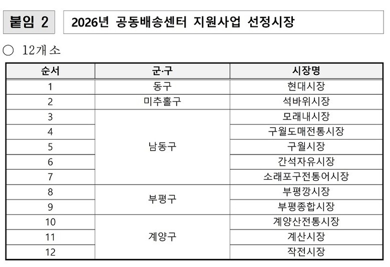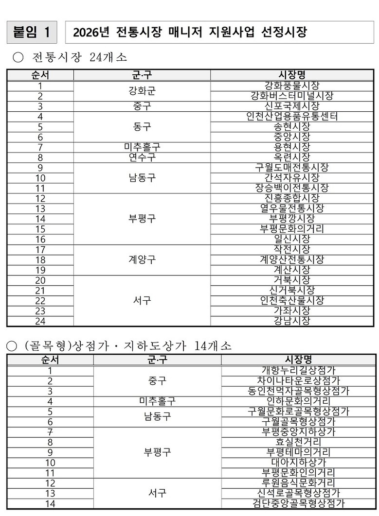시는 지난 2025년 하반기 공모와 심사를 통해 ▲시장 매니저 38개소(전통시장 24개소, 상점가 14개소) ▲공동배송센터 12개소를 최종 선정했다. 선정된 시장에는 1개소당 1인에 대해 인천시 생활임금을 기준으로 매니저 급여가 지원된다.