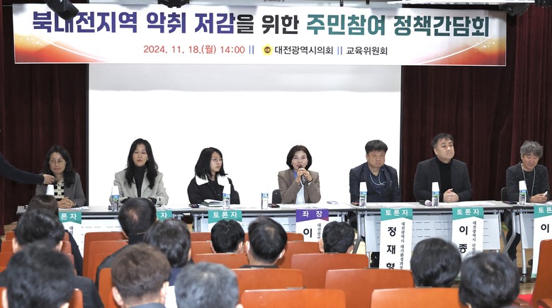 [대전 세계타임즈=이채봉 기자] 대전시의회 교육위원회는 18일 북부여성가족원 3층 시청각실에서 지역주민들의 악취로 인한 불편사항과 고충을 청취하고, 대전시와 유성구, 대덕구의 악취저감을 위한 구체적인 정책방향 설명과 함께 시민 불편 해소를 위한 대책을 숙의하고자‘북대전지역 악취 저감을 위한 주민참여 정책간담회’를 개최했다.