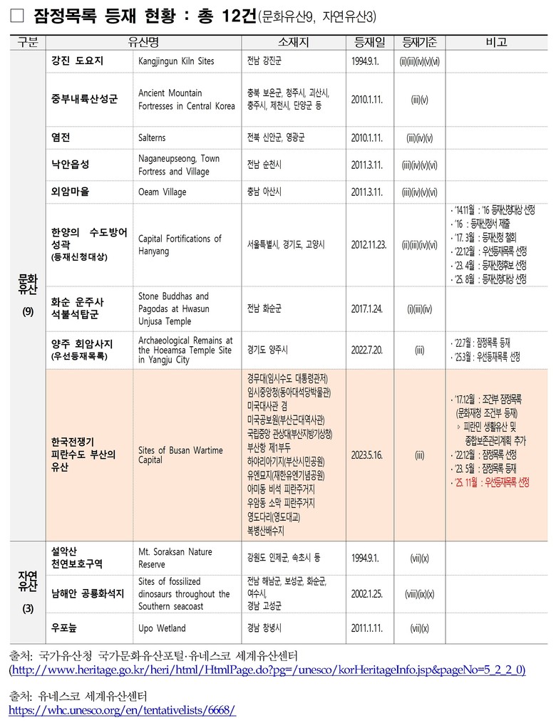 현재 국내 잠정목록 유산 14건 가운데 우선등재목록으로 선정된 유산은 지난 3월에 선정된 ‘양주 회암사지유적’과 부산시의 ‘한국전쟁기 피란수도 부산의 유산’ 2건이다.