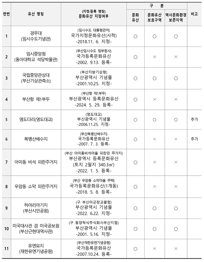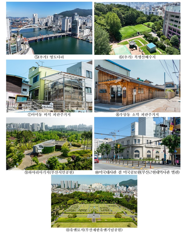 * 구성유산 11곳: ▲[기존 9곳] ①경무대(임시수도대통령관저), ②임시중앙청(동아대학교 석당박물관), ③아미동 비석 피란주거지, ④국립중앙관상대(부산기상관측소), ⑤미국대사관 겸 미국공보원(부산근현대역사관 별관), ⑥부산항 제1부두, ⑦하야리아기지(부산시민공원), ⑧유엔묘지(부산재한유엔기념공원), ⑨우암동 소막 피란주거지 ▲[추가 2곳] ⑩영도다리(영도대교), ⑪복병산배수지