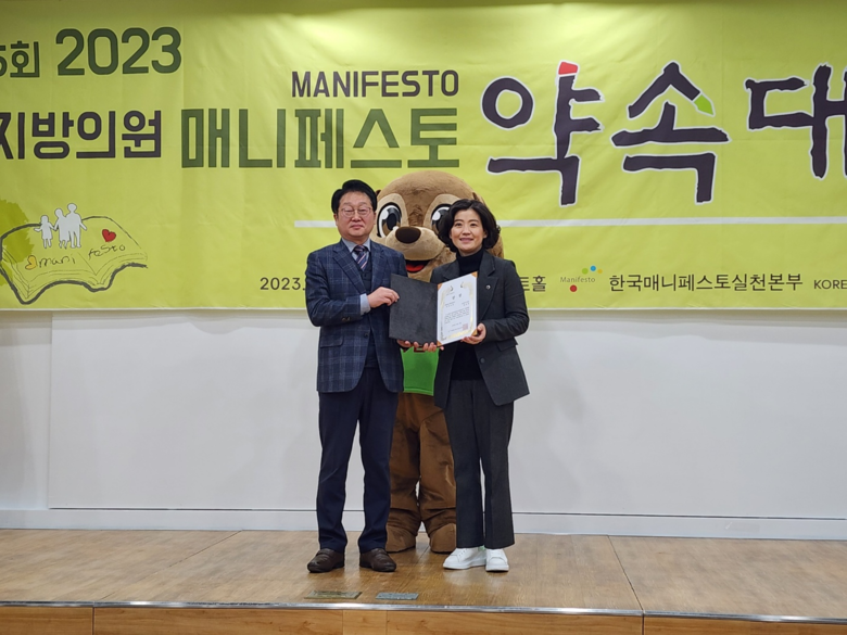 한편, 매니페스토본부는 ‘제15회 2023 지방의원 매니페스토 약속대상’에서 공약이행 분야는 광역의원 10명(최우수상 4명, 우수상 6명)과 기초의원 4명(최우수상 2명, 우수상 2명) 등 총 14명, 좋은조례 분야는 광역의원 59명(최우수상 26명, 우수상 33명)과 기초의원 53명(최우수상 25명, 우수상 28명) 등 총 112명이 선정했다.