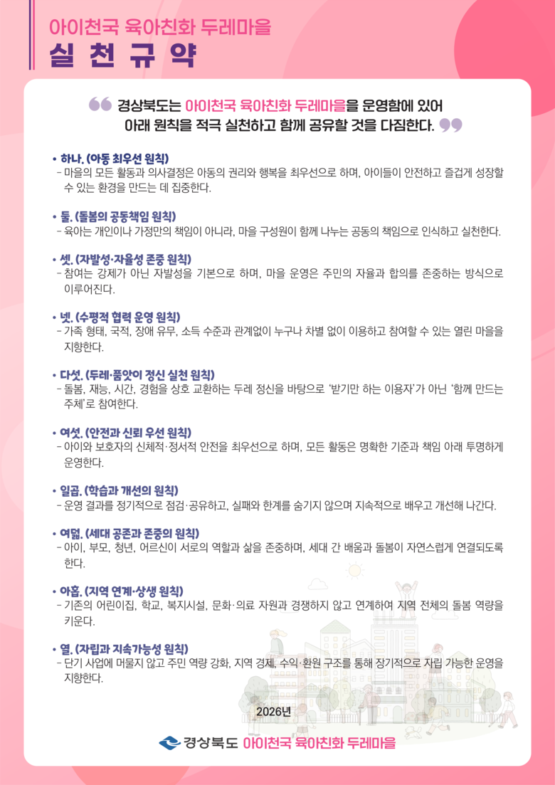 실천 규약은 아동의 권리와 행복을 최우선 가치로 삼고, 육아를 가정의 부담이 아닌 마을의 공동 책임으로 규정한다. 또한 주민의 자발성과 수평적 협력을 바탕으로 두레·품앗이 정신을 실천하는 자생 공동체 운영을 핵심으로 한다.
