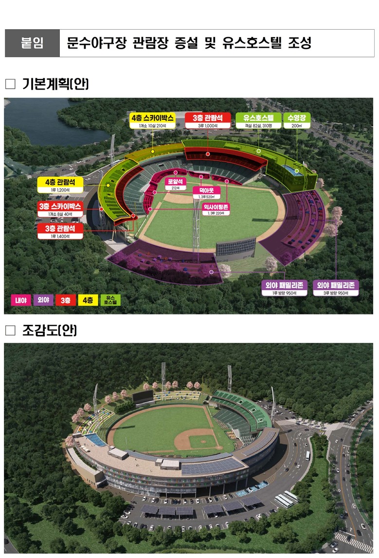 또한 문수야구장의 관람장은 기존 1만 2,068석 규모에서 내야 4,100석, 외야 1,900석을 더한 총 6,000여 석을 증설해 최종 1만 8,000여 석 규모로 조성된다.