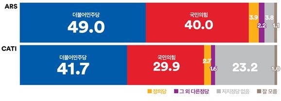 [세계타임즈 = 심귀영 기자] 여론조사 꽃이 5월 26일부터 27일까지 양일간 실시한 5월 4주 차 ARS 정당 지지율 조사에서 더불어민주당은 지난주 대비 5.4%p 내린 49.0%, 국민의힘은 3.9%p 오른 40.0%로 집계됐다. 지난주 진보층과 중도층의 결집으로 18.3%p까지 벌어졌던 양당 간 격차는 다시 한 자릿수로 좁혀졌다.