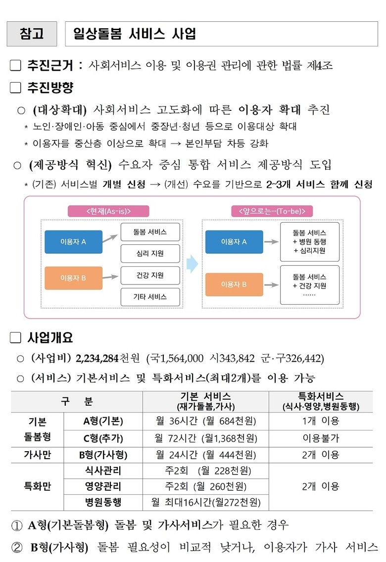 ‘일상돌봄 서비스’는 돌봄이 필요한 청·중장년과 가족돌봄청년을 대상으로 재가 돌봄, 가사 지원, 식사·영양관리, 병원 동행 등 일상생활에 필요한 다양한 서비스를 통합 제공하는 사업이다.