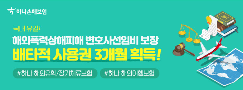 [세계타임즈 = 이송원 기자] 하나손해보험은 지난 3월 출시한 ‘해외폭력상해피해 변호사선임비 특약’이 올해 손해보험사 최초로배타적사용권을 3개월 획득하였다고 밝혔다.