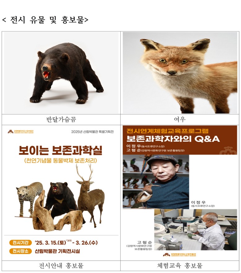 이번 전시는 설악산에서 마지막으로 포획된 반달가슴곰을 비롯해 산양, 수달, 두루미 등 총 7종 25점의 천연기념물 동물 박제를 실물로 전시한다. 또한, 그동안 보지 못했던 보존과학자들의 작업 과정을 공개하여 유물 보존의 지식과 기술을 공유하는 개방형· 참여형 전시로 기획되었다.