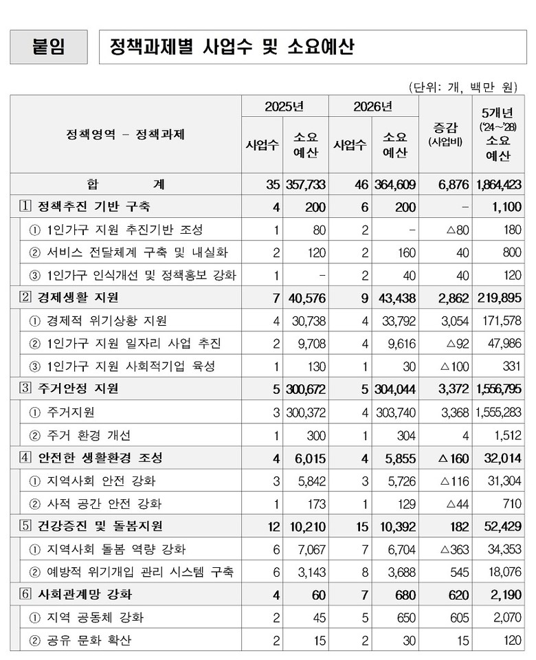 특히 이번 계획은 정책 수요를 적극 반영해 지원을 강화했다. 2025년 1인가구 실태조사 결과, 경제 기반 확립과 주거비 부담 완화가 가장 시급한 정책 지원 분야로 나타남에 따라, 정책수요가 높은 주거지원 사업을 세부사업에 추가하는 등 주거 및 경제 분야에 대한 지원 비중을 확대했다.