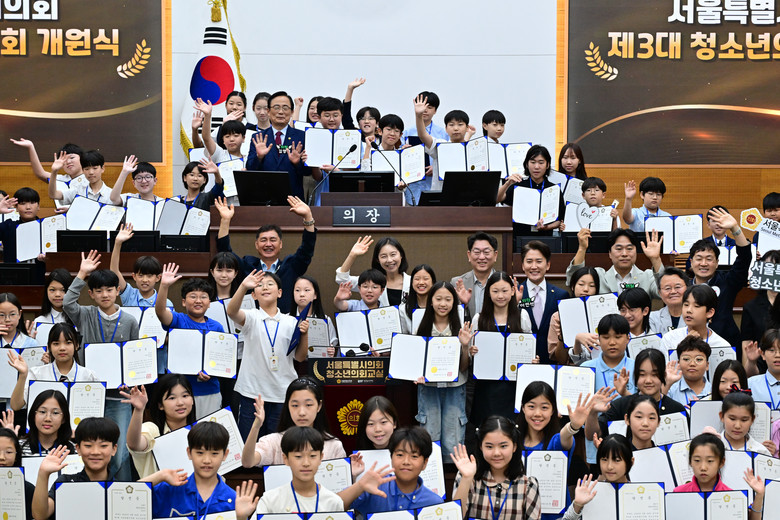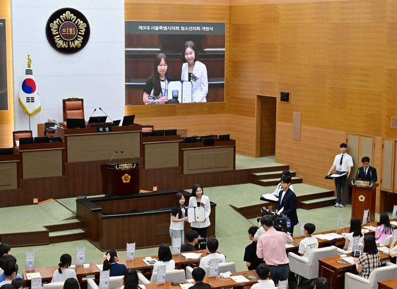 서울특별시의회(의장 최호정)는 제3대 청소년의회 개원식을 의회 본회의장에서 19일 개최했다고 밝혔다. 서울시 초등학교 5,6학년 중에서 청소년들의 투표를 통해 선출된 80명의 제3대 청소년 시의원은 개원식을 시작으로 5개월간 의정활동 체험을 하게 된다.