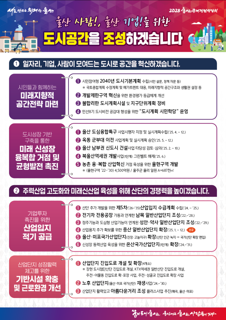 시민들과 함께하는 미래지향적 공간전략 마련 등 추진 [울산 세계타임즈=이호근 기자] 울산시는 ‘울산 사람!, 울산 기업! 을 위한 도시공간 조성’을 목표로 2025년 도시 분야 정책을 추진한다고 밝혔다.