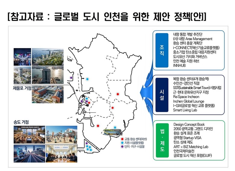 인천연구원 배은주 선임연구위원은 “인천광역시가 세계적인 글로벌 도시로 도약하기 위해서는 전체를 아우르는 도시디자인을 통해 바다와 섬의 자연경관, 공항과 항만의 인프라, 혁신과 예술의 창의성, 그리고 시민과 공동체의 역량을 하나로 묶는 것이 핵심이며, 이를 위한 통합적 접근과 체계적인 준비가 필요하다.”라고 밝혔다.