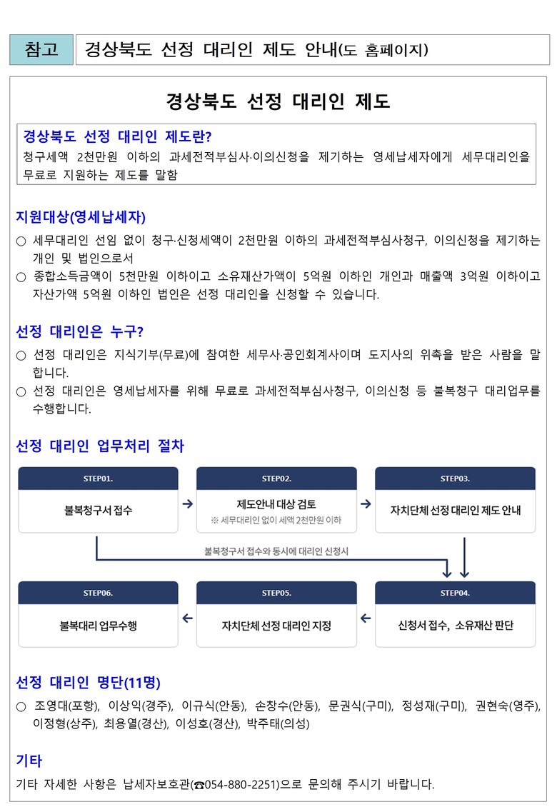 경상북도는 이에 더해 현행 납세자가 지방세 불복 청구는 시군 세정 부서에, 세무 대리인 선정 신청은 도 납세자보호관에게 따로따로 신청하던 불편을 개선해 앞으로는 지방세 불복 청구를 시군 세정 부서에 신청할 때 세무 대리인 선정 신청도 One Stop으로 함께 할 수 있도록 했다.