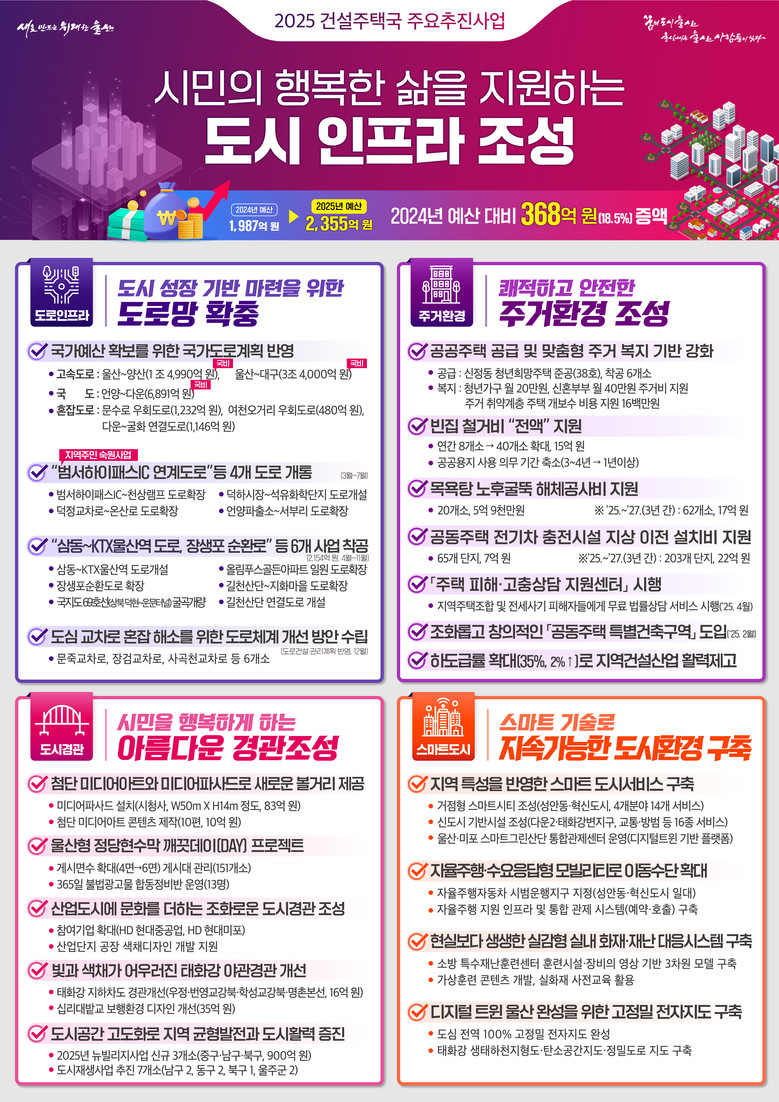도로망 확충, 공공주택 공급확대 및 도시경관 개선 등 [울산 세계타임즈=이호근 기자] 울산시는 2025년 건설주택 분야 주요업무 계획을 발표하고 시민의 행복한 삶을 지원하는 도시기반(인프라) 조성을 위한 다양한 사업을 본격 추진한다고 밝혔다.