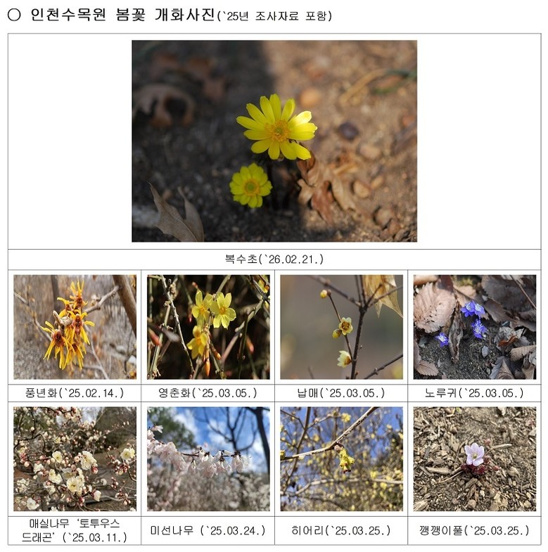 한편, 인천수목원의 봄은 절기상 ‘우수(雨水)’인 2월 중순부터 본격적으로 시작된다. 풍년화, 영춘화, 노루귀, 매화, 깽깽이풀, 히어리, 미선나무 등이 차례로 꽃을 피우며 수목원 곳곳을 다채로운 색으로 물들인다. 다양한 봄꽃을 한자리에서 감상할 수 있어 수목원을 찾는 시민이 많은 시기다.