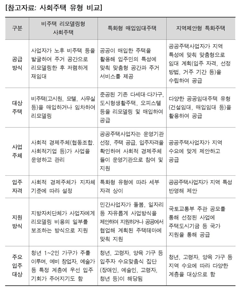 사회주택은 부족한 공공임대주택 재고를 보완하면서 여러 계층에게 다양한 주거 선택지를 제공하는 역할을 수행하고 공동체성을 강조하는 경향이 있으나, 법・제도적 미비, 사회경제적 주체의 재정 역량, 재정적 지원에 따른 지자체 재정 부담 등이 과제로 언급된다.