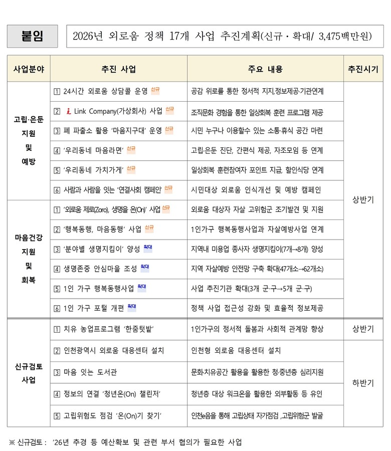 이는 외로움에 대응하는 방식 자체를 바꾼 것으로, 사후 대응이나 대상별 지원이 아니라, 관계가 끊어지기 전에 개입하는 구조를 만들겠다는 것이 인천시의 전략이다.