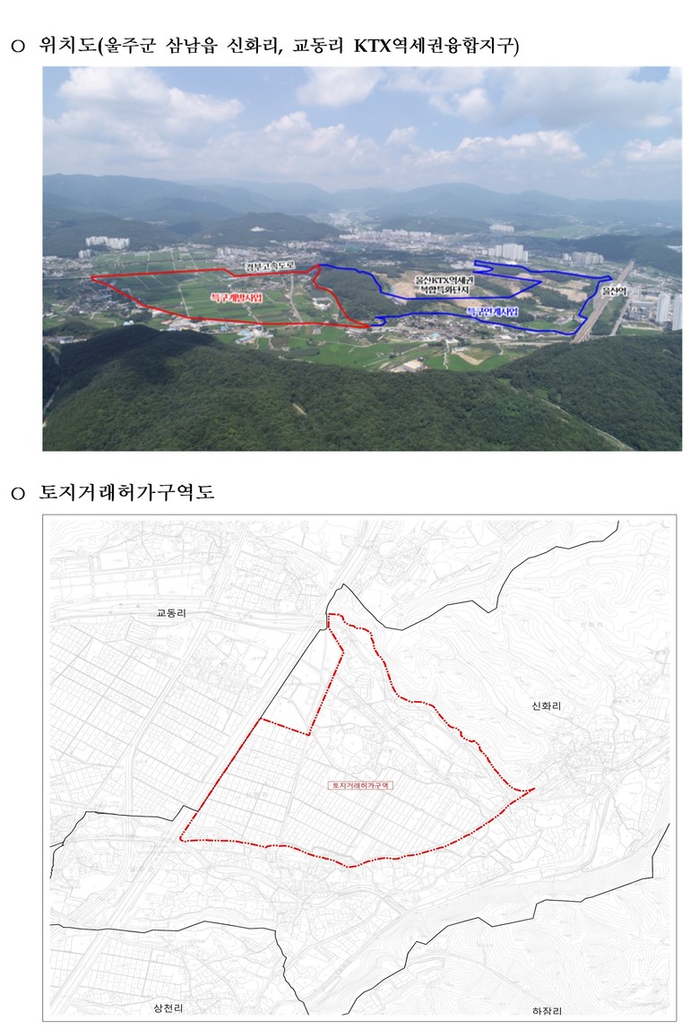 율현구역 도시개발사업부지는 토지거래 허가구역 변경 지정 [울산 세계타임즈=이호근 기자] 울주군 삼남읍 신화리, 교동리 ‘케이티엑스(KTX)역세권 복합특화단지’와 중구 다운동·울주군 삼남읍 신화리, 교동리 ‘도심융합특구’ 일원이 토지거래허가구역으로 재지정된다. 이와 함께 울주군 청량읍 율리 ‘율현구역 도시개발사업부지’ 일원 토지거래허가구역은 변경 지정된다.