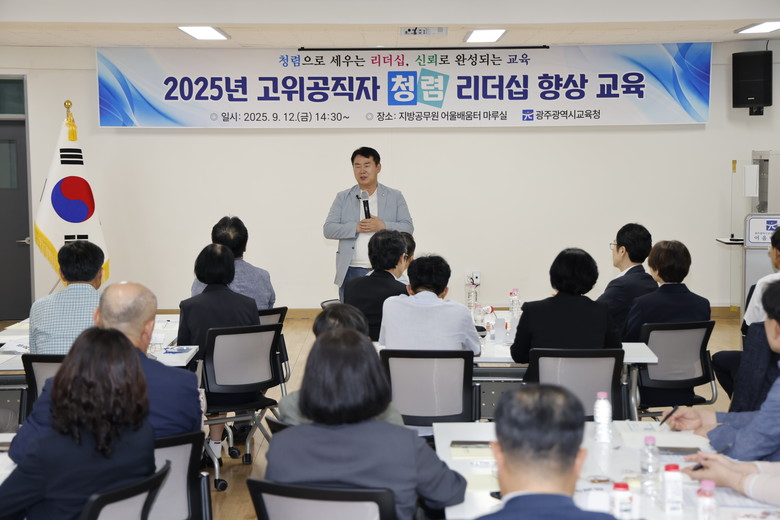 [광주 세계타임즈=손권일 기자] 광주시교육청(교육감 이정선)은 12일 시교육청 지방공무원어울배움터 마루실에서 본청 및 산하기관 4급(상당) 고위공직자 50여 명을 대상으로 ‘2025년 고위 공직자 청렴리더십 향상 교육’을 실시했다.