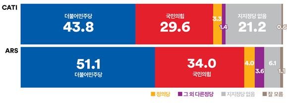 대구·경북 강원·제주지역은 양당 지지율이 모두 하락했다. 매주 우세정당이 바뀌는 부산·울산·경남 지역에서는 더불어민주당은 15.2%p 상승, 국민의힘 13.7%p 하락으로 더불어민주당이 다시 우세지역이 되었다. 연령별로 보면 국민의힘 지지가 강한 60대, 70세 이상에서 국민의힘은 큰 폭으로 하락하고 더불어민주당은 큰 폭으로 상승, 더불어민주당의 지지율 상승을 견인했다. MZ 세대의 무당층 비율은 점차 증가하는 추세인데, 무당층의 비율이 큰 18~29세의 경우 소폭이지만 3회 연속 상승으로 과반에 육박하는 48.6%p로 집계되었으며 30대의 무당층도 4.3%p 증가함으로 무당층이 다시 30%대로 올라섰다(30대: 더불어민주당 41.9% > 무당층 32.7% > 국민의힘 21.2%).같은 기간 실시한 ARS 조사에서 더불어민주당은 2주 전 대비 2.4%p 상승한 51.1%, 국민의힘은 6.3%p 하락한 34.0%로 집계되어 양당의 격차는 17.1%p로 크게 벌어졌다.