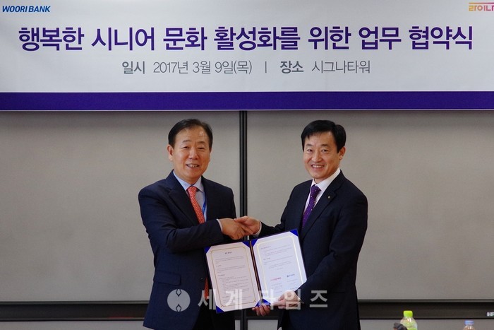 [세계타임즈 김장수 기자] 우리은행은 지난 9일 서울 종로구 삼봉로 소재 라이나시그나타워에서 라이나전성기재단과 ‘시니어문화 활성화를 위한 업무협약’을 체결했다고 10일 밝혔다.