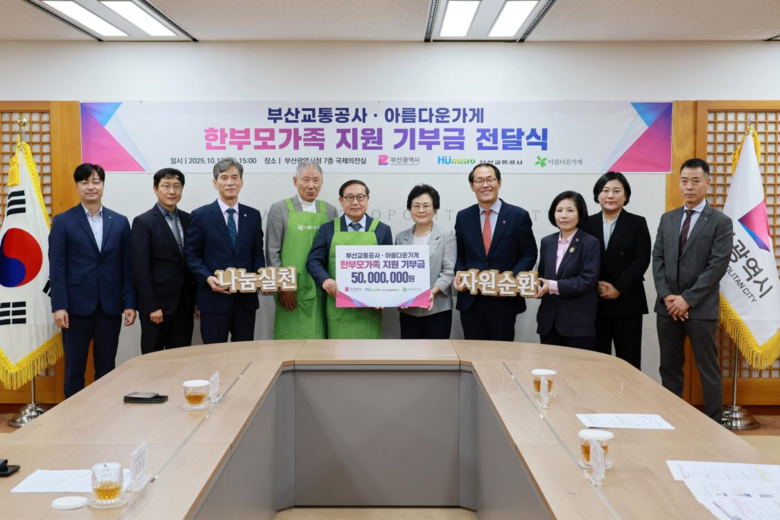 [부산 세계타임즈=이용우 기자] 부산시(시장 박형준)는 어제(13일) 오후 3시 시청 국제의전실에서 부산교통공사, 아름다운가게와 함께 저소득 한부모가족 지원을 위한 기부금 전달식을 개최했다고 밝혔다.