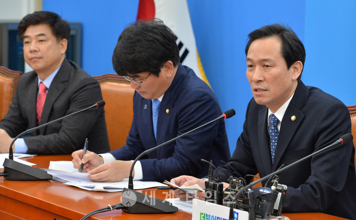 14일 오전 서울 여의도 국회 더불어민주당 원내대표 회의실에서 열린 원내대책회의에 참석한 우상호(오른쪽) 원내대표가 모두발언하고 있다. 우 원내대표는 황교안 대통령 권한대행 국무총리는 신속하게 대선 일정을 확정해야 한다고 말했다. 2017.03.14.