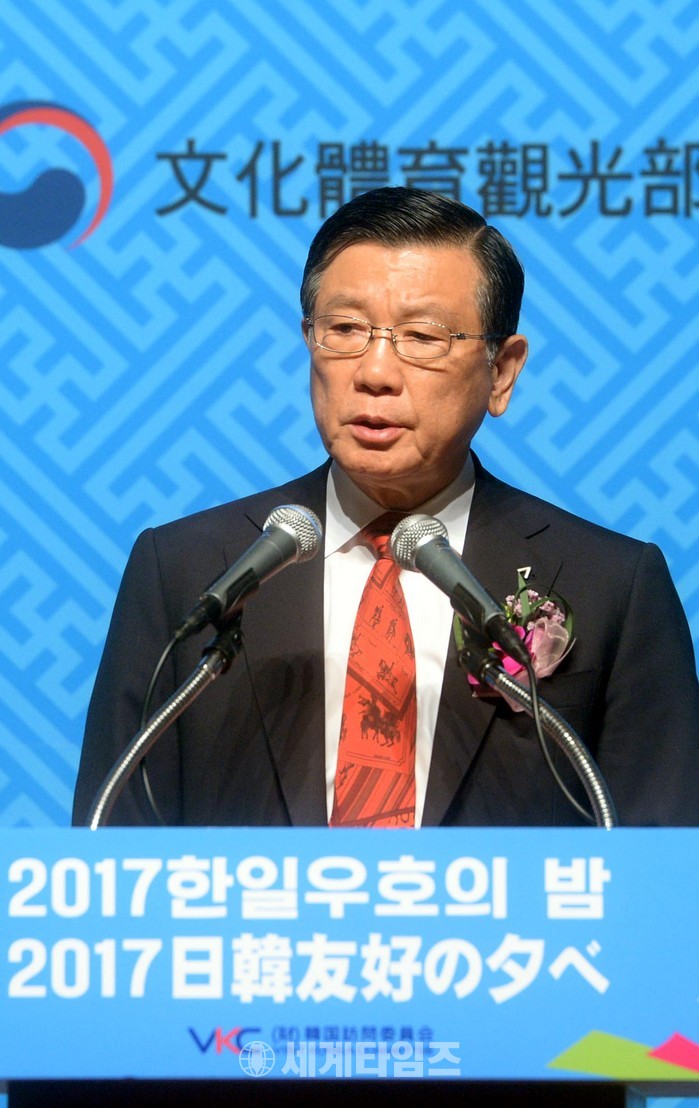 11일 오후 서울 중구 롯데호텔에서 열린 2017 한일우호의 밤에서 한국방문위원회 위원장인 박삼구 금호아시아나 회장이 환영사를 하고 있다. 2017.06.11.
