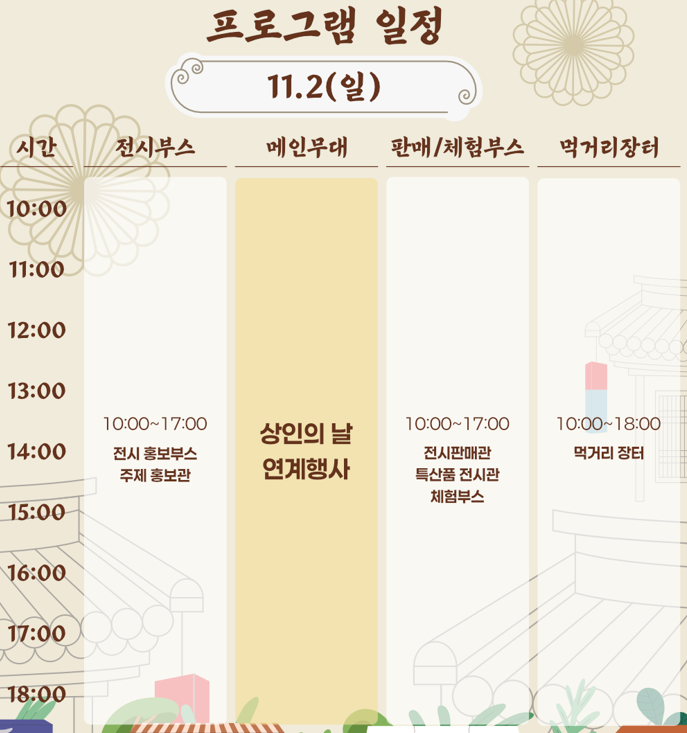 마지막 날인 11월 2일에는 「제3회 부산광역시 상인의 날」 행사가 함께 열린다. 2천여 명의 상인이 참여해 ▲개막식 ▲상인역량강화 교육 ▲축하공연 등 상인 간 화합과 자긍심을 높이는 뜻깊은 자리가 마련된다.