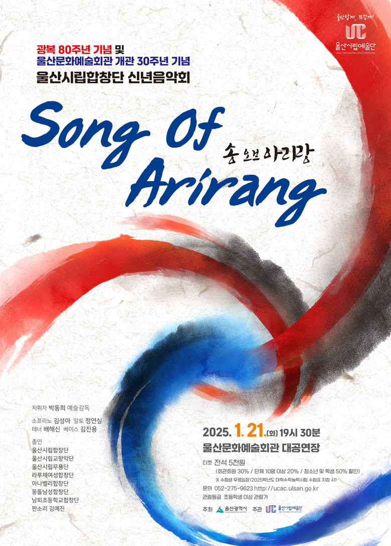 21일 오후 7시 30분, 울산문화예술회관 대공연장 [울산 세계타임즈=이호근 기자] 울산시립합창단이 을사년 푸른 뱀띠의 해를 맞아 오는 1월 21일 오후 7시 30분 울산문화예술회관 대공연장에서 기획연주 2025 신년 음악회 송 오브 아리랑(Song of Arirang)을 마련한다.