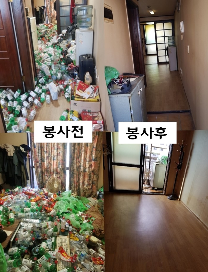 집안청소 봉사단 김원배 부단장은 “엄청난 물량의 집안쓰레기를 치우는데 힘은 들었지만, 봉사후 집안환경이 깨끗하게 되어서 행복과 보람을 느낀다.”고 말했다.