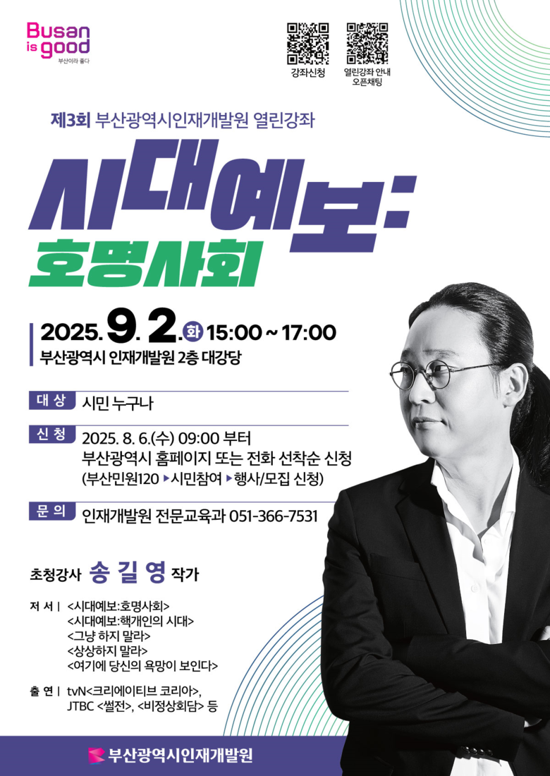 송광행 인재개발원장은 “시민 여러분이 사회 흐름을 이해하고 미래를 준비하는 데 유익한 시간이 되길 바란다”라며, “앞으로도 지식과 경험을 나눌 수 있는 강연을 꾸준히 이어가겠다”라고 전했다.