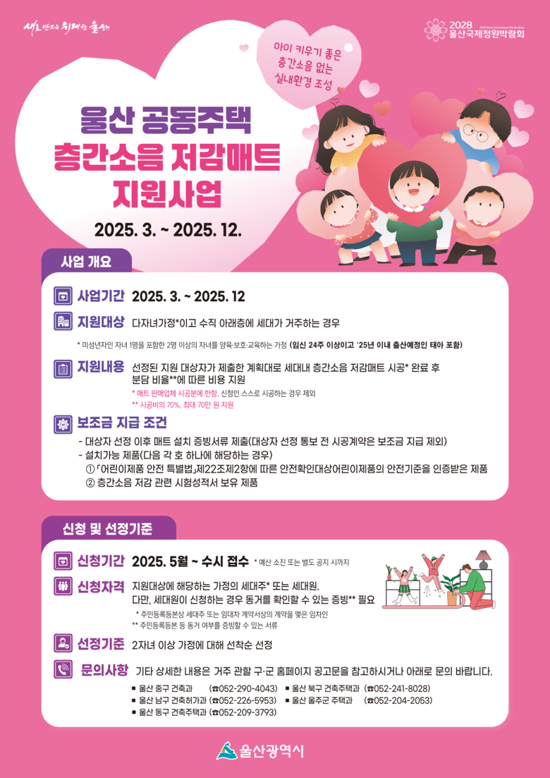 울산시는 지난 3월부터 ‘공동주택 층간소음 저감매트 지원사업’을 2자녀 이상 가정을 선착순 선정해 시행한 바 있다.