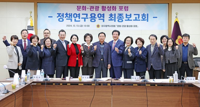 [대구 세계타임즈=한윤석 기자] 대구시의회 의원연구단체 ‘문화ㆍ관광 활성화 포럼’(대표 권기훈 의원)은 12월 13일(금), 의회 3층 회의실에서 소속 의원이 참석한 가운데 ‘대구아리랑 문화ㆍ관광 활성화 방안’과 ‘생활인구 증가를 위한 체류형 관광지 조성방안 연구’ 용역 최종 보고회를 개최했다.