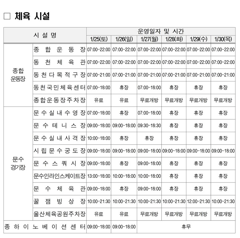 울산의 체육시설도 설 연휴 기간 즐길 수 있다. 종합운동장, 동천체육관, 동천다목적구장, 시립문수궁도장은 연휴 기간 휴장 없이 운영된다. 꿀잼빙상장 또한 설 당일(1월 29일) 2시간 단축 운영(낮 12시~오후 9시 30분)을 제외하고 연휴 기간 내내 정상 운영(오전 10시~오후 9시 30분) 한다.