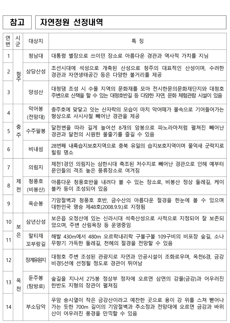 이에 충북도는 인문성, 심미성, 개방성, 자연성 등 평가 기준을 적용해 인공성을 최소화한 관광명소로 청남대, 수주팔봉, 의림지, 삼년산성, 월류봉, 화양구곡, 도담삼봉 등 자연정원 30개소를 선정했다.