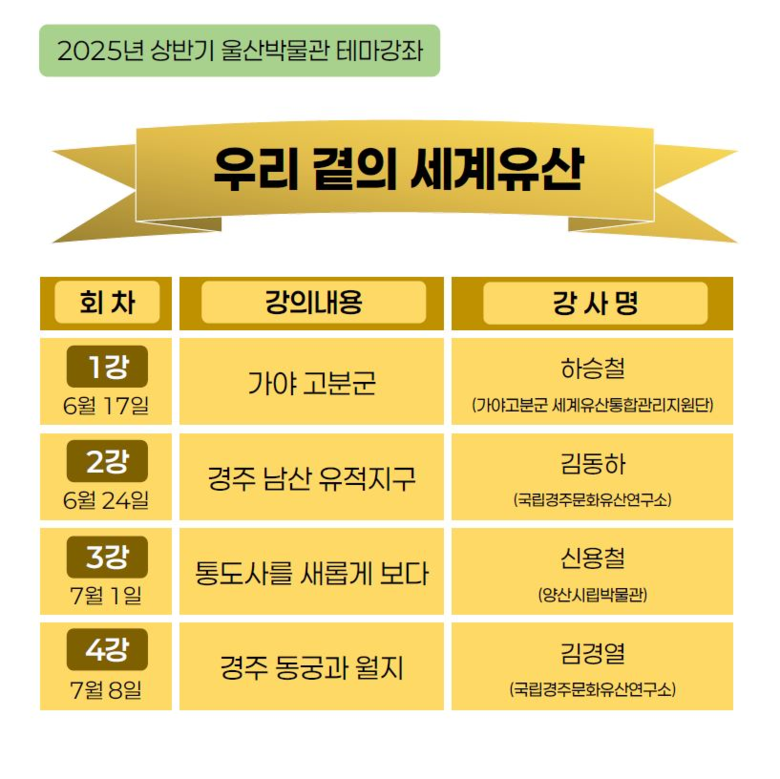 강좌는 ▲6월 17일 하승철 경남연구원 가야고분군 세계유산통합관리지원단 선임조사연구위원의 ‘가야 고분군, 고대 동아시아 가야문명의 독보적인 증거’를 시작으로 ▲6월 24일 김동하 국립경주문화유산연구소 전문위원의 ‘경주 남산 유적지구’ ▲7월 1일 신용철 양산시립박물관장의 ‘통도사를 새롭게 보다’ ▲7월 8일 김경열 국립경주문화유산연구소 학예연구사의 ‘경주 동궁과 월지’ 등으로 구성된다.