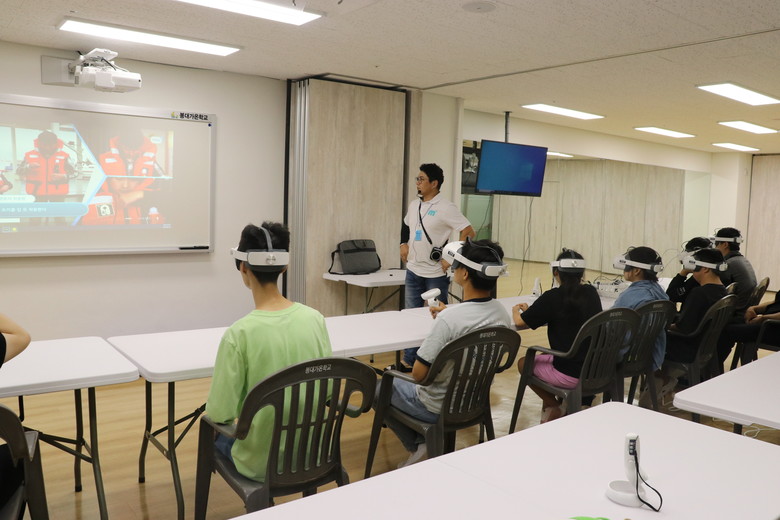 본교 2층 동적활동 공간에는 가상의 수상안전 프로그램을 통해 생존수영을 경험할 수 있도록 VR 교육이 진행되며, 이를 위해 교사들은 사전에 학생의 장애 정도를 고려하여 난이도를 정하고 프로그램을 마련했다.