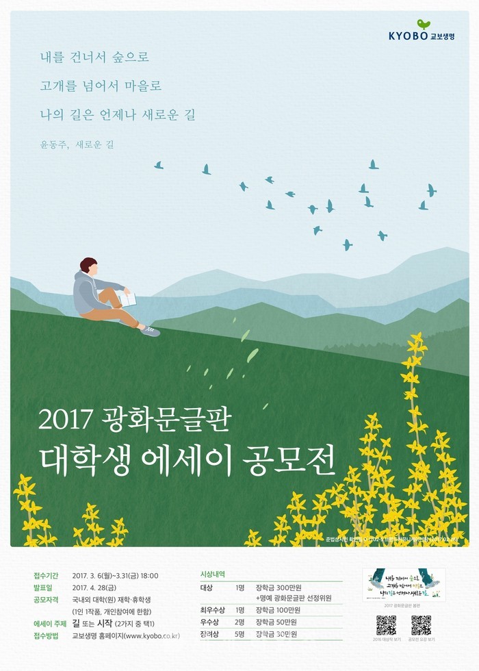 [세계타임즈 김장수 기자] 교보생명은 청춘들과 소통하고 그들의 이야기에 귀 기울이기 위해 ‘2017 광화문글판 대학생 에세이 공모전’을 개최한다고 9일 밝혔다.